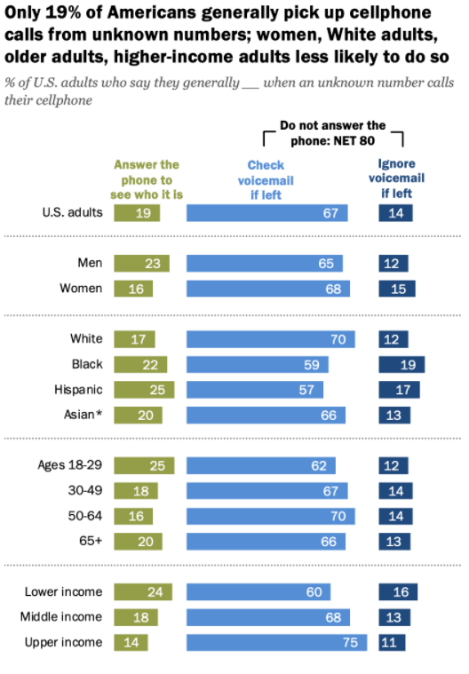 Most of our phone calls now happen on smartphones and most people don't answer the phone for unknown callers. A December 2020 survey from the Pew Research Center found that an average of only 19% respond to a call from an unknown phone number. However, 67% will check a voicemail after the fact, while 14% ignore the voicemail. In one sense this is not news; it has been a developing trend for years and is a response to the epidemic of fraud and spam calls. But what's also interesting: surveys indicate that, for customer service, people typically prefer talking to humans on the phone vs. other options (text, chat, email), though there are some nuances. Non-white younger males with lower incomes were the most likely to answer unknown calls, Pew found.