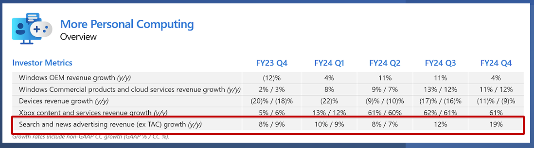 Earlier this week Microsoft announced better-than-expected quarterly revenues of $64.7 billion, up 15% year-over-year. However, Search and News ad revenues were up 19%. That's a roughly 10 point gain vs. a year ago and a 7 point gain sequentially. Microsoft CEO Satya Nadella, on the company's earnings call, said "We are ensuring that Bing, Edge, and Copilot are collectively driving more engagement and value to end-users, publishers, and advertisers ... we again took share across Bing and Edge." He didn't provide any third party data or specific discussion about taking share (presumably from Google) but he made the claim. Nadella added, "Our share gains accelerated this year, driven by AI." In that context he also touted the recently showcased Bing AI-organized SERPs – an arguably more thoughtful take on Google's AI organized pages. If we look at StatCounter data, which may not be entirely accurate, it shows a very slight search marketshare gain for Bing over time (about 1 point since last year). Microsoft CFO Amy Hood previously said that one point of search share could translate into $2 billion of new search revenue for the company.