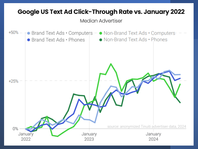 Based on an early analysis, Tinuiti found that AI Overviews depressed ad clicks on non-branded keyword mobile SERPs. This comes from their Q2 digital ads benchmarking report. According to the findings, "as Google rolled out AIOs to all US users in May, non-brand text ads on both computers and phones saw a meaningful drop in click-through rate (CTR) compared to April, and a much larger drop than that seen for brand keywords." When AIOs were "dialed back" shortly thereafter, "CTR for other segments recovered, but it did not for non-brand phone text ads." The report goes on to heavily qualify its findings and suggest multiple factors may be involved in the observed CTR drop. However, these data suggest that another motivation for the AIO pullback may have been an adverse impact on revenue and not just bad PR. Another finding from the report is that ad clicks were down but ad spending is up: "Spending on Google search text ads was up 13% Y/Y in Q2 2024, which was driven almost entirely by CPC growth."