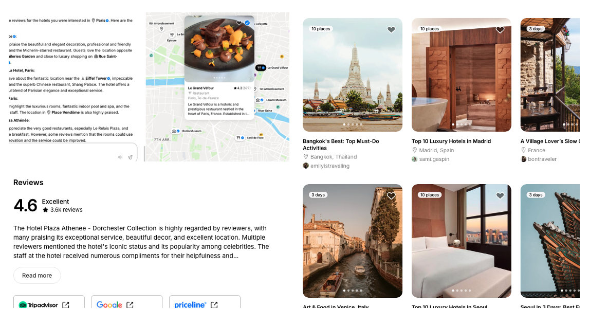 At Google's developer conference in May, the company demonstrated AI-based conversational search for complex queries. It allowed users to ask multi-part queries and follow-up questions. Among other scenarios, this would be useful for travel planning. However that experience has yet to materialize. But a new AI travel site Mindtrip offers a pretty compelling version of that and points the way to the future of "travel search." I've only used it twice and haven't verified the accuracy or quality of the underlying data. But I like it. It's primarily a conversational UI, like ChatGPT. But it also includes a socially curated "explore" area for trip inspiration. Right now to plan a trip to Paris, for example, I need to do a bunch of discrete searches on Google – although there is a generic AI Overview sample itinerary. Mindtrip gives you the ability to do "faceted search," starting broadly and then narrowing and refining in the chat UI without initiating a new query. If signed in, it saves your searches so you can engage in multiple planning sessions without having to start over. The site uses Google Maps so you get the benefit of all that data. And you can book hotels through affiliate partners such as Tripadvisor, Priceline, Agoda and others. It's a pretty complete experience.