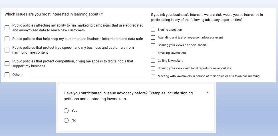 Google is facing escalating legal and regulatory challenges on multiple fronts. In the US, a Texas-led state Attorneys General antitrust suit against the company recently survived a motion to dismiss. It's about to settle a location-privacy class action. In Europe, Google lost its appeal of a €4+ billion antitrust fine and faces a new €25 billion lawsuit, brought by "publishers," for alleged anticompetitive behavior in the digital ad market. There are other potential antitrust suits and pending legislation in the US, as well as ongoing enforcement actions in Europe. Many will fail but others will succeed. Against these mounting problems Google has engaged in a sustained lobbying campaign, which includes regular outreach to Google's small business customers and "astroturfing." This week the company sought to identify SMBs sympathetic to its cause through a survey (below) and line them up to petition, email and call lawmakers on its behalf.
