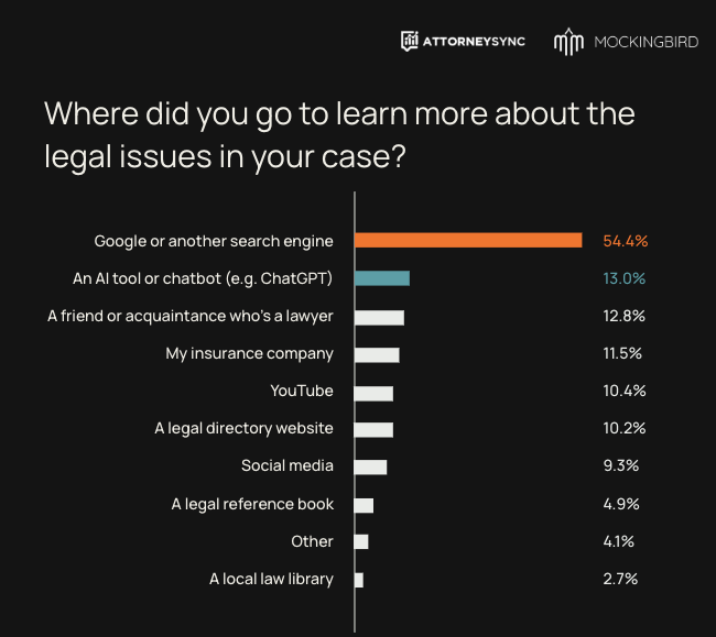 One of the things we're tracking is how consumers are (or aren't) using AI as an alternative to Google for lawyer discovery. In our two recent national surveys we asked people where they would turn first and what would they rely on most to find an attorney. Basically, word-of-mouth and Google rank #1 and #2. AI is much farther down the list for bottom of the funnel lawyer discovery. But this finding doesn't tell the whole AI story. People are inclined to use AI to learn about the issues in their case. That's currently separate from lawyer finding, but it may not be for long. The differences between informational research and bottom of the funnel attorney lookups may quickly erode. As Google shows more AI Overviews (AIOs) and exposes more people to AI Mode, the distinction between "traditional" Google and AI becomes less meaningful. Our data show that people generally like and value the AI experience. And in user testing, we don't see AIOs "stealing" organic clicks – that's a job for LSAs. Instead the AIO often boosts lawyer awareness, which may prompt a click on a follow-up search. In our January survey people expressed openness to using AI Mode for lawyer finding. So despite the low adoption of AI today as a lawyer discovery tool, legal marketers must prepare for a near-term future in which the funnel is more compressed and informational legal research very quickly turns into lawyer finding.