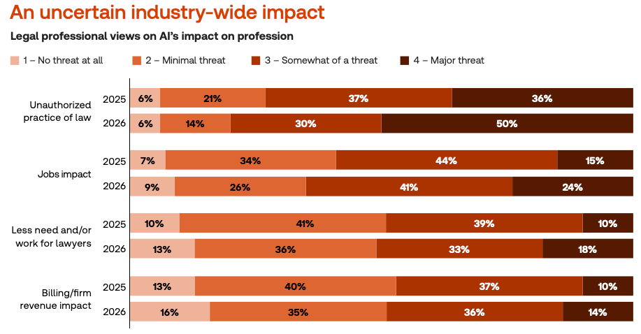 According to recent survey data from the Thomson Reuters Institute, 41% of law firms and 47% of corporate legal departments have now adopted generative AI. The data were collected in Q4 2025 among 1,500 professionals in law, accounting, corporate risk and government. It was an extensive multi-country study but with the largest respondent groups coming from the US, UK and Canada (results aren't segmented by country). Among the AI adopters, 55% of lawyers reported using AI at least daily. Top use cases were: legal research (80%), document review (74%), document summarization (73%), brief or memo drafting (59%), correspondence drafting (55%) and contract drafting (49%). The majority of law firms (62%) and corporate legal departments (72%) said they believed AI should be utilized in their work. Yet there's also ambivalence and concern about potential negative impacts on the profession, including job displacement (see chart below). The survey reflects something of a disconnect between lawyers and clients about when AI use is appropriate. The bulk of AI platforms being used by firms constitute the usual suspects (i.e., ChatGPT, Gemini, Claude), some enterprise-focused AI tools (e.g., Copilot), and specialized industry AI software (e.g., Harvey). Yet less than a quarter of lawyers say they're tracking an ROI. When they are, the metrics are mainly cost savings and employee adoption.