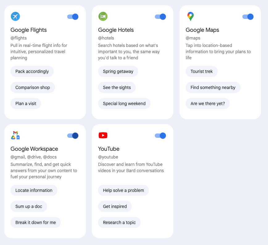 After a couple of months with no updates, yesterday Google rolled out Bard Extensions (similar to ChatGPT plug-ins). Bard extensions were first announced at Google I/O this year with the promise of third party integrations, including Adobe, Kayak, OpenTable, TripAdvisor, Spotify and others. "Bard will be able to tap into all kinds of services from across the web," said Google's Sissie Hsiao, at the time. However, what showed up yesterday was a Google-only selection of apps (below), including Google Workspace. The latter enables useful personalization of Bard results (Neeva was trying a version of this), but raises concerns about data leakage. Using the "@" symbol before a query brings up a menu of extensions, enabling you to choose individual services. For example, you can search Google hotels only or Google Maps for "best hotels NYC" and get different results. The most discussed feature is the ability to "fact check" a Bard result with Google Search by using the "G" logo ("Google It") button at the bottom of the page. In my quick tests this worked most of the time.