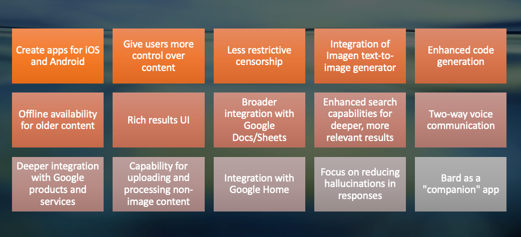 - People are either asking for specific features relevant to their work/lives or see Bard as a general "assistant" and want a broad array of capabilities, well beyond "search."