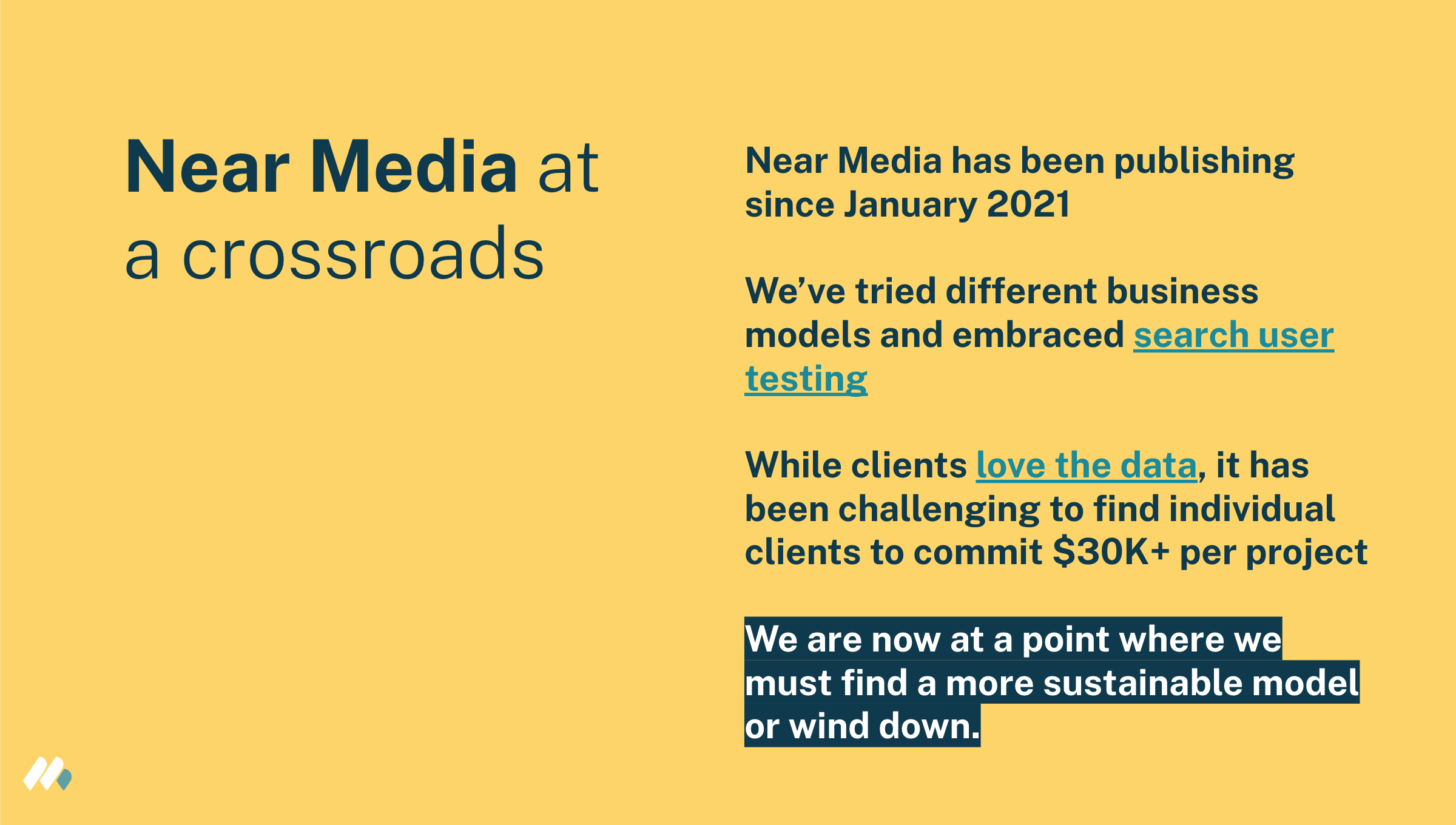 We’ve tried different business models and embraced search user testing. While clients love the data, it has been challenging to find individual clients to commit $30K+ per project. We are now at a point where we must find a more sustainable model or wind down.