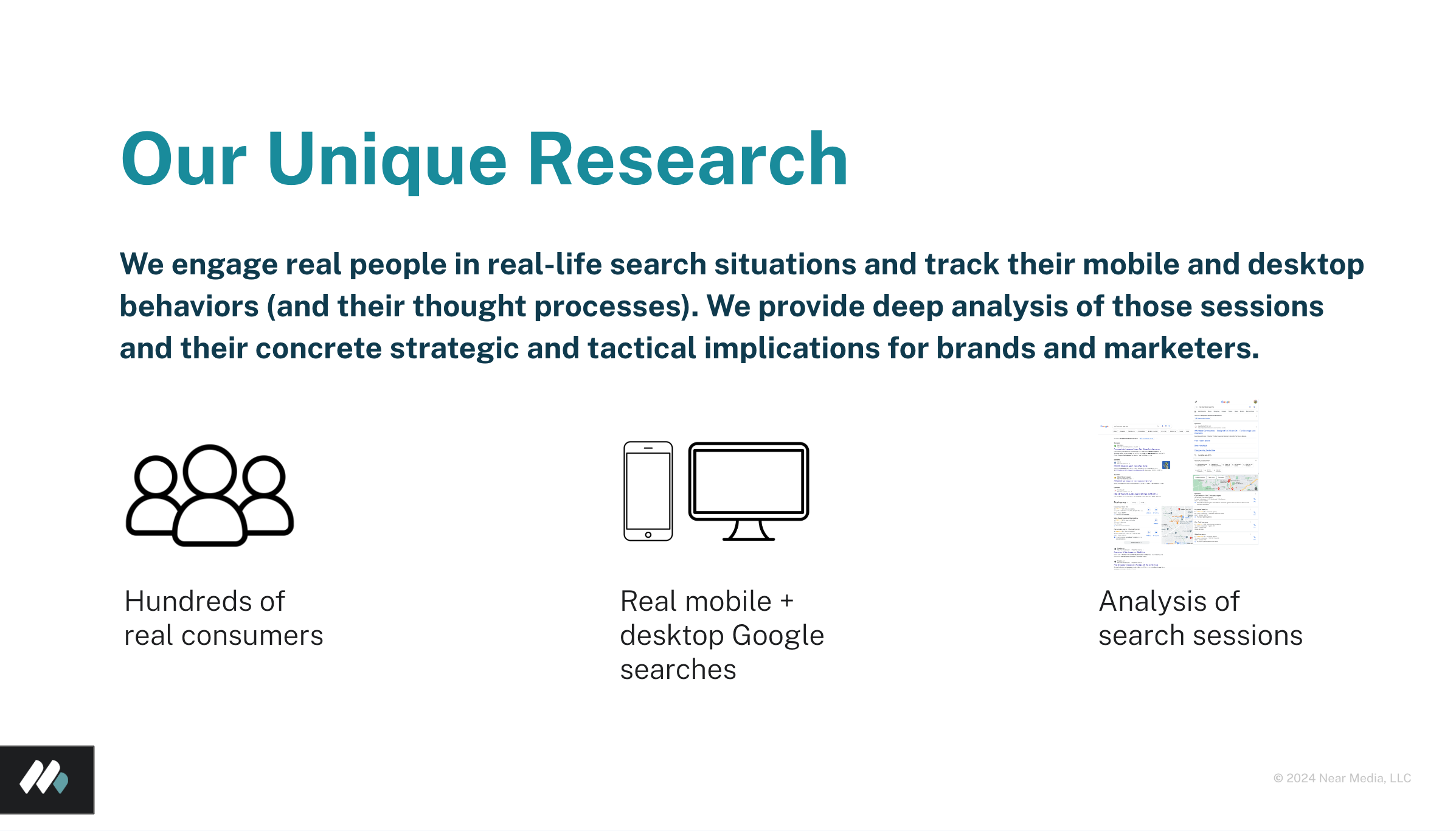 We engage real people in real-life search situations and track their mobile and desktop behaviors (and their thought processes). We provide deep analysis of those sessions and their concrete strategic and tactical implications for brands and marketers.
