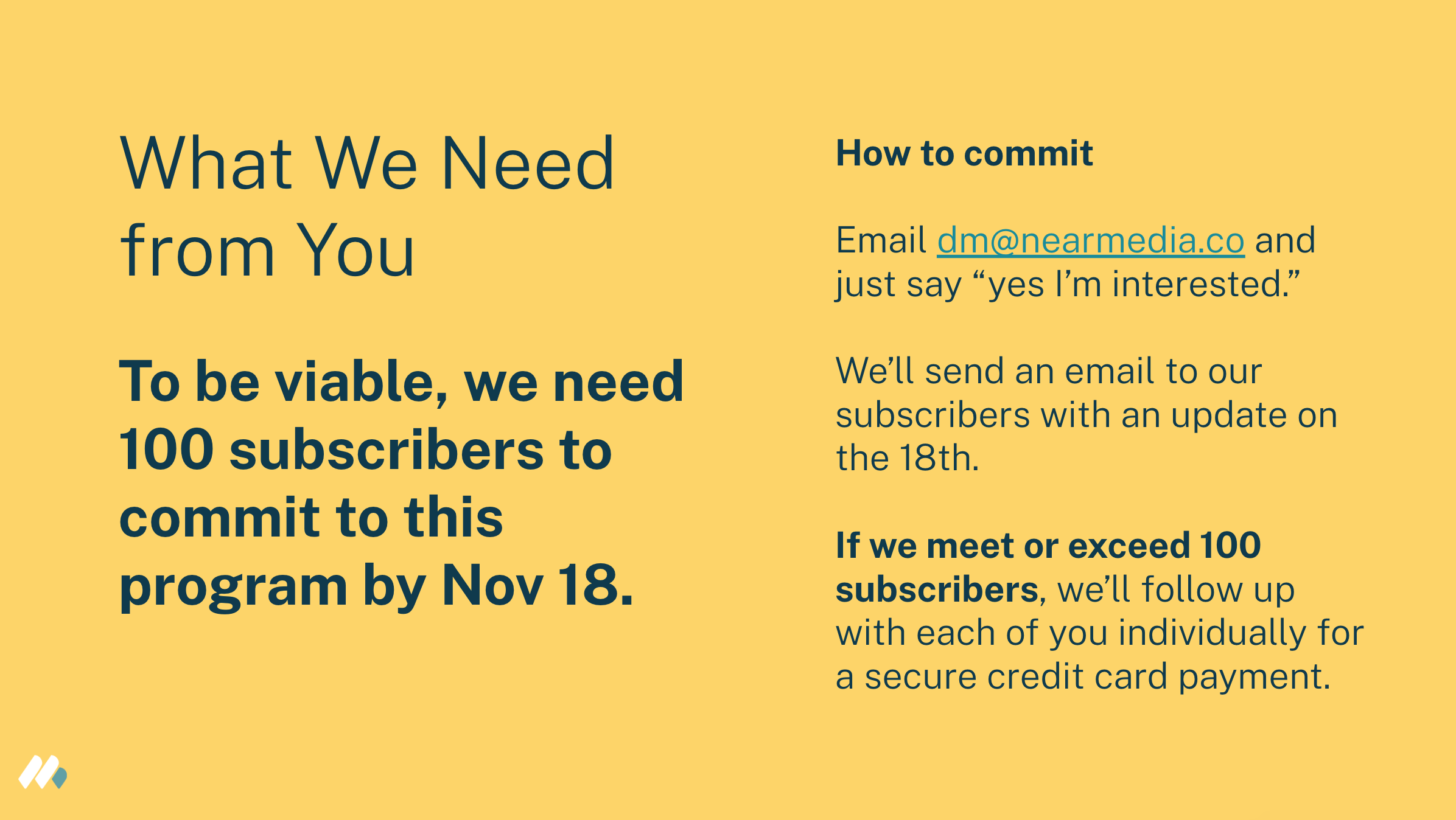 How to commit: Email dm@nearmedia.co and just say “yes I’m interested.”