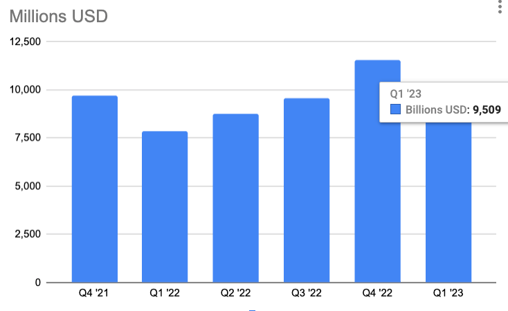 This week was full of tech earnings, including Google, Microsoft, Meta, Snap, Pinterest and Amazon. Google, Microsoft, Meta and Amazon all beat analyst expectations. However, there were mixed results and softness all around. Snap and Pinterest saw user growth but flat or declining revenue. Google's search revenue grew a modest ~2% to $40.4 billion on the strength of travel and retail. However, Google's retail rival Amazon saw ad growth of 21%. Amazon reported $9.5 billion in ad revenue, up from $7.9 billion a year ago. Total Amazon advertising proceeds for 2022 were ~$38 billion. That's well behind Google and Meta, but ahead of Microsoft's 2022 total of just over $12 billion. Outside of its main e-commerce sales (flat YoY), Amazon's largest revenue sources are: 1) third party seller fees, 2) AWS, 3) consumer subscriptions (Prime, etc.) and 4) ads. Pulling up the rear, Amazon's physical stores (mostly grocery) generated $4.9 billion in Q1 (up 7%).
