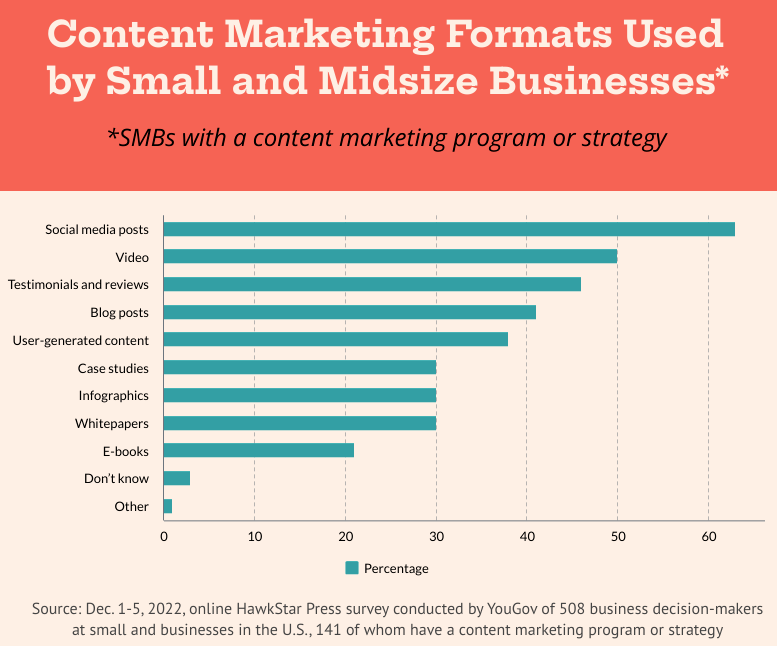 While 77% of SMBs say content marketing is important, 70% have no program or strategy. That's according to a late 2022 survey of 508 SMBs in the US, conducted by YouGov (for HawkStar Press). Small business is defined here as having up to 500 employees, though most are much smaller. Roughly 28% of respondents said they had a content marketing program. However more than half (55%) of that group "allocate[ed] less than 10% of their marketing budget to it." Despite this, 77% (of the 28%) said their content marketing was "successful" (not defined). Most SMB content marketers appear to be outsourcing (60%) though some had between 1 and 20 employees working on it in house. Reasons for not having a content marketing program included "no time" (46%) and "don't know where to start" (41%). The top content types being produced were: 1) social media, 2) video, 3) reviews and 4) blogging. ROI perceptions followed that order.