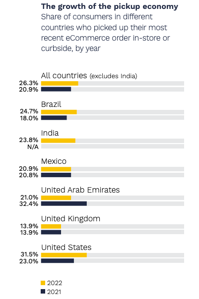 BOPIS (buy-online-pick up-in-store) is a horrible acronym; click and collect is much better. But BOPIS is the term most commonly used in North America. A new survey from Cybersource has found that BOPIS describes ~32% of US users' most recent e-commerce purchases. Of the six countries featured in the survey (Brazil, Mexico, India, UAE, UK, US), the US had the largest share of BOPIS commerce: "nearly one-third of U.S. consumers, or 16 million individuals, who made their most recent purchase online, picked it up in-store or curbside — a 37% year-over year increase." This is especially true in a grocery context. The report cites rising shipping costs as well as delivery uncertainty as factors driving consumer BOPIS adoption. Let's be clear, the survey isn't saying that one-third of all e-commerce is now click and collect. Rather, this was the most recent order. It's important to keep in mind that consumers sometimes misrepresent their behavior in surveys. Still, it's a striking finding.