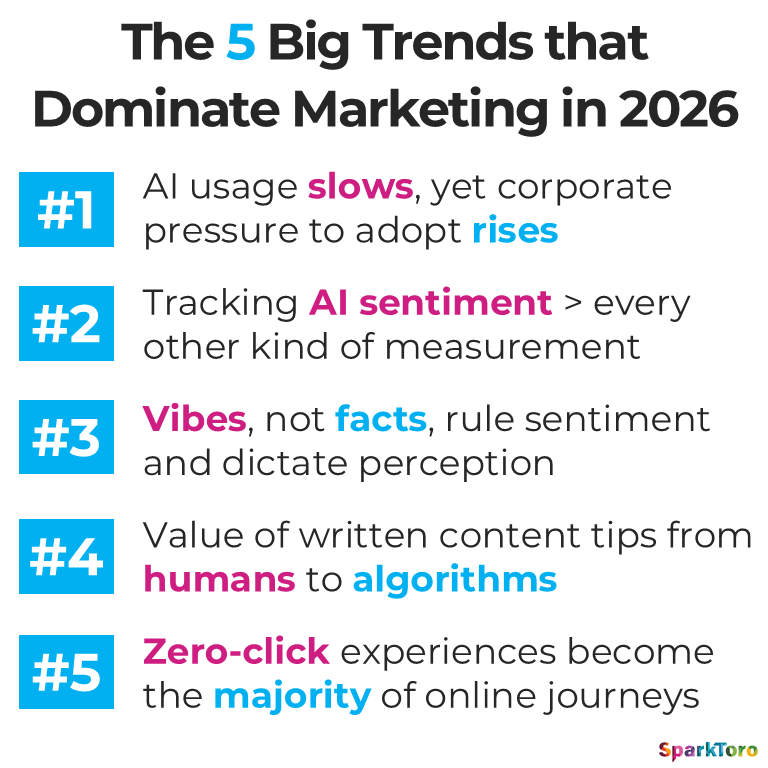All right. So among the predictions that you made earlier, not too long ago, you talked about five big marketing trends. AI usage is going to slow, yet there’ll be continuing corporate pressure for employees and companies to adopt it. AI sentiment tracking is inherently unreliable and people are disproportionately investing in that while underinvesting in other areas. There’s a credibility crisis happening to some degree online. We’re starting to see more and more content written for algorithms and less for humans, more AI abstraction of content and summaries, and more zero-click experiences becoming the majority of online journeys.