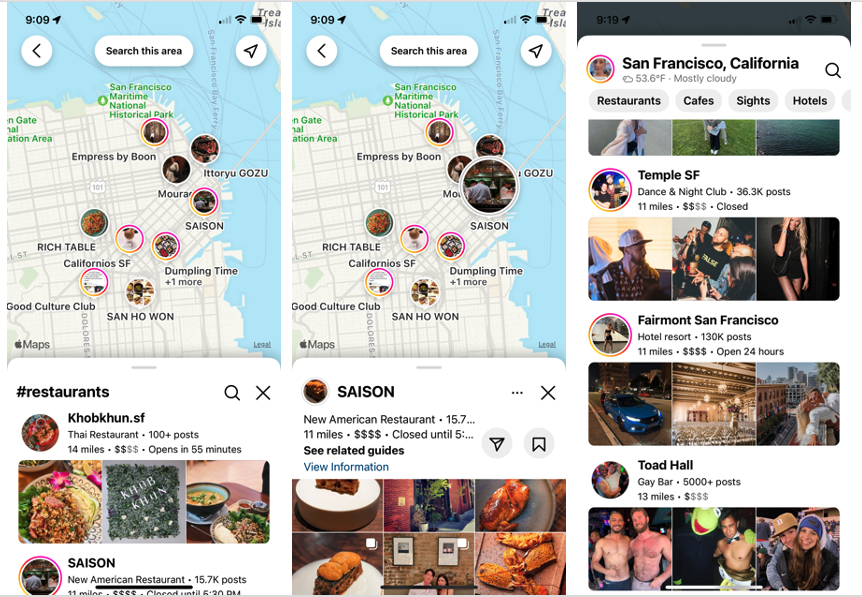 Instagram has introduced an upgraded, interactive and searchable map experience. Users can now search, browse and drag maps to find things nearby. Results can also be filtered by categories such as restaurants, hotels, cafes, sights. The previous Instagram map featured only posts and couldn't easily be used as a local search tool. Users can also now search by tagged locations. And locations can be saved and shared with contacts. I found it somewhat awkward in my brief testing this morning, but I'm not a heavy instagram user. As we previously discussed, Google SVP Prabhakar Raghavan said last week that internal Google research found up to 40% of younger users were conducting local searches on TikTok and Instagram instead of Google.