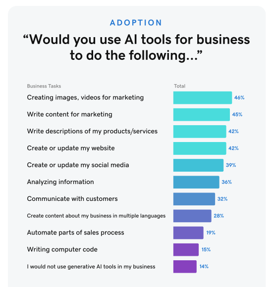 Claiming to be the "first-ever survey of U.S. small businesses on generative AI" (it's not) GoDaddy published findings from an April 2023 poll of just over 1K US businesses with 50 or fewer employees. Roughly 38% of SMBs said they had tried AI tools, some "for fun" (27%) and some "for business" (11%). Overwhelmingly ChatGPT (70%) and Bard (29%) were the ones used. Interestingly, Bing did not appear at all, though Microsoft-owned Github did. The dominant use cases were, not surprisingly, marketing (64%) and content creation (61%). Interestingly, 75% (of the 38%) were highly satisfied with the AI's performance. In terms of anticipated future use cases (graphic below), creating images/videos for marketing, marketing content, product/service descriptions, website creation/updates and social media content topped the list of aided responses. Also not a surprise, GenZ and Millennials owners were more likely than Gen X or Boomers to have tried these tools.