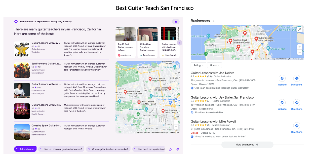 The Local Pack and Google SGE local results co-exist in the new experimental AI SERP. But the treatment of SGE is changing or evolving. One example is YMYL. It was there and now it's mostly not. More generally, Google offers an "automatic" SGE result in some cases but in others users are asked to "generate" SGE results by clicking a button. Google appears to be moving in what might be described as a more conservative direction, showing automatic SGE results less often. I previously said I liked SGE but wasn't sure how useful it is. That's especially true in a local context. The Local Pack usually appears immediately below the SGE Snapshot and two or all three Pack results are usually present in the Snapshot. The SGE result has more stuff in it but is less useful than the existing Local Pack. What Google should do is combine the best elements of both into a new Local Pack.
