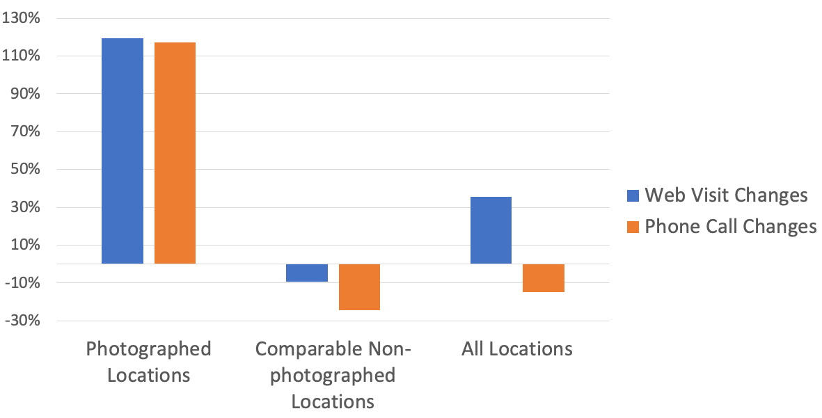 To measure the impact of the photography, I looked at Google Business Profile Insights on a year over year basis. I tracked changes in Google Insights actions (web visits and phone calls) for photographed locations and compared them to locations not photographed.