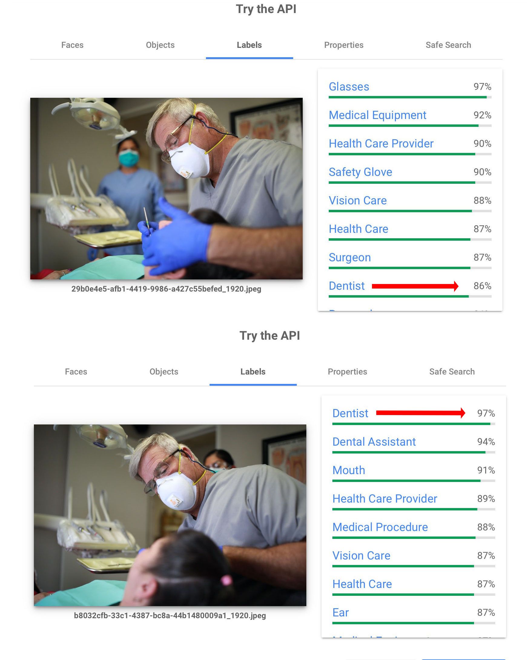 The two images below show how Google's Cloud Vision is both sophisticated and immature at the same time. Taken during an actual shoot at a dentist's office, both photos clearly appear to be shots of a dentist, with little visually to distinguish them.