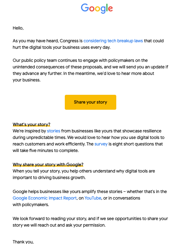 Most of big tech companies use small businesses (SMBs) as a sword or a shield in advocating for or against regulations or public policies. That also shows up in competitive contexts. For example, Facebook invoked SMBs as it argued against Apple's mobile privacy initiatives. Google has used SMB welfare to oppose pending antitrust legislation. Generally, the argument goes: if the government regulates us, it will hurt SMBs (and consumers). As the email below indicates, Google has been trying to scare SMBs into helping the company fight Congressional antitrust efforts. Google (and Amazon) have also enlisted seemingly independent groups such as the Connected Commerce Council to oppose antitrust legislation. Claiming to be a grassroots SMB advocacy organization, the Connected Commerce Council is pure "astroturf," funded by Google and Amazon.