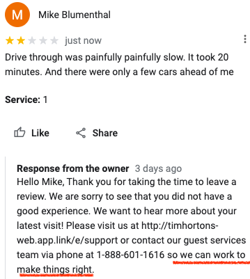 Customer service is hard but it is even harder when corporate and franchisees can't get their stories straight. On my way to a meeting I decided to grab a "quick" coffee to go at the local Tim Hortons. Twenty minutes later I finally got through the drive-through and was late to every appointment for the rest of the afternoon. I wrote a review. In response Tim Hortons corporate encouraged me to reach out so that they could "make things right." What did I have to lose? The only thing more painful than waiting for 20 minutes for a to-go coffee was wading through the Tim Hortons post-review support interaction. After filling in two forms and interacting with two support staff and providing ad nauseum details about a single order for a single cup of coffee, I was provided with CX happy talk and told they would let the local franchisee know. Then I got a survey asking how the support rep did.