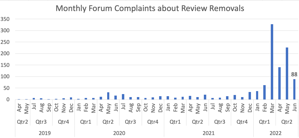 This led me to update my tracking of missing review complaints in the Google Business Profile Forums. Small business complaints about Google taking down too many reviews or not catching fake reviews tend to be a very good proxy for how aggressive Google's algorithm is towards spam reviews.