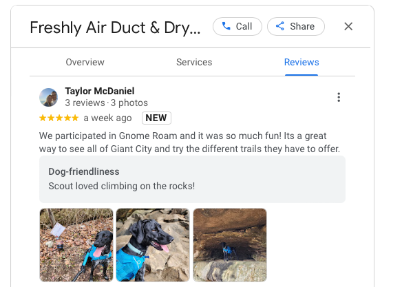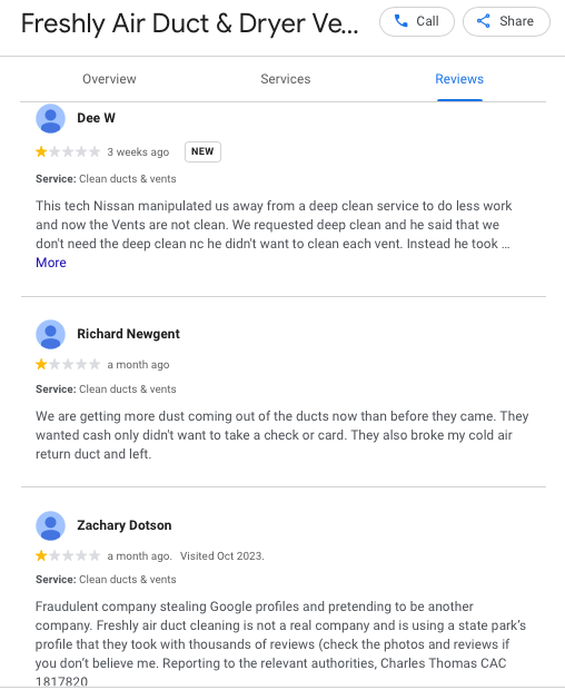 Concerned that the work was shoddy and the price extremely high, Charles decided to check more deeply into Freshly Air Duct & Dryer Vent Cleaning, call the business back and ask for a redo. In doing so he realized that the many reviews were not for the business itself but related to a state park.