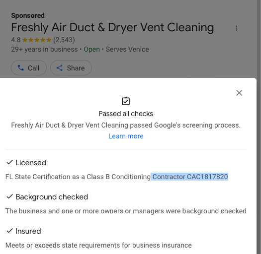 Realizing that it was indeed a scam, Charles called his bank and was able to cancel his check. He also called the police, who proceeded to tell him that not only was there nothing they could do but that it wasn't fraud and he might owe money to the contractor. According to the police, Google had likely just misaligned a license number and he should worry about the contractor coming back on him for his cancelling of the check. And after all he had the Google guarantee to fall back on.