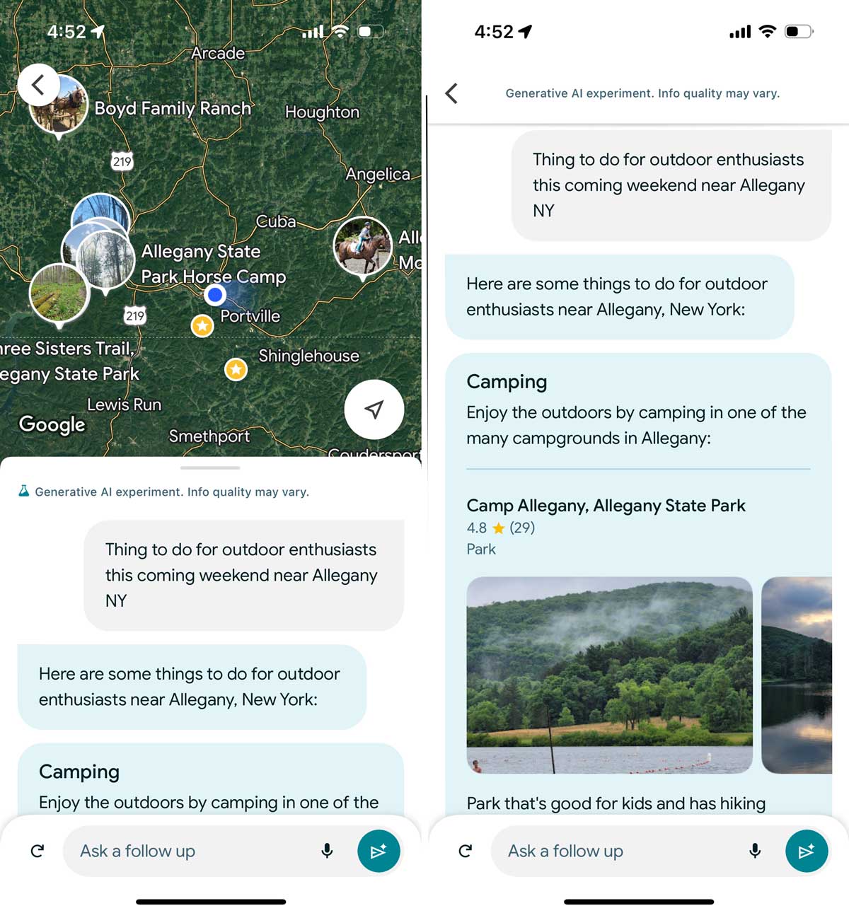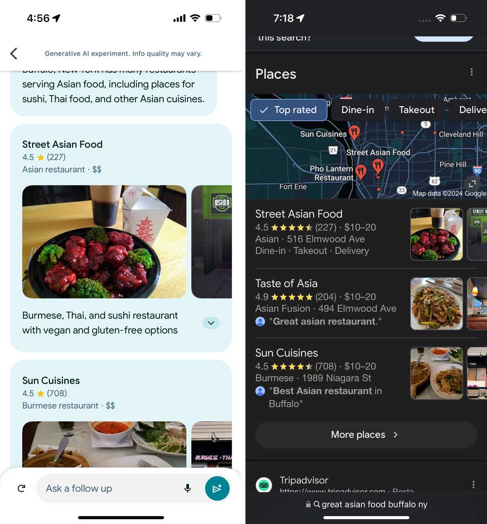 In early February, Google announced a large Local Guide test of generative AI on mobile Google Maps. Initially only available on Android, it's now available for iOS and I have been able to get a sense of the capabilities. As we noted in our newsletter, it appears to be SGE bolted into mobile Google Maps.