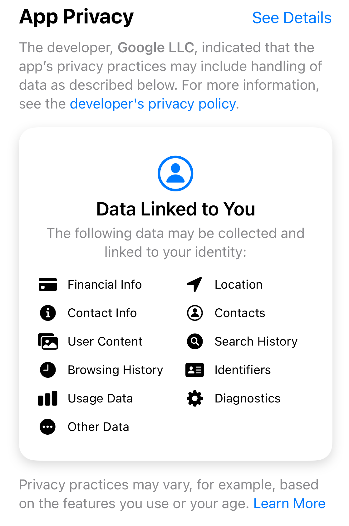 Google was slow to release app updates this winter and, as we noted in early March, had not added many of the labels. Since then, Google did update most of its apps. And early last week Google finally updated Google Maps and its attendant privacy label.