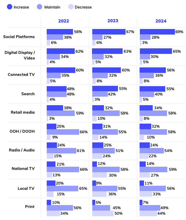 Practically every week there's a new survey about generative AI. According to the recently published 2024 Advertising Outlook Report from Mediaocean, the top generative AI use cases for marketers, brands and agencies are: 1) Data analysis, 2) Market research, 3) Copywriting, 4) Image generation, 5) Customer service, 6) SEO. By comparison, Copywriting was the number one use case a year ago. While most of the 1,000 survey respondents are optimistic about the outlook for 2024, they're also quite anxious about the end of cookies and reduced measurement capabilities. In terms of expected marketing and ad spending plans, the growth areas are: 1) Social, 2) Display/Video, 3) CTV and 4) Search (which presumably includes PPC and SEO). Traditional media channels are poised for further decline. While social media can certainly be a direct response channel, the spending increases appear to be highly brand/branding related. However, brand advertising came in third after "performance-drive [sic] paid media" and "measurement & attribution capabilities" on the list of critical marketing investments. "First-party data mastery" was a lower priority, which is strange given the anxiety around cookie deprecation.