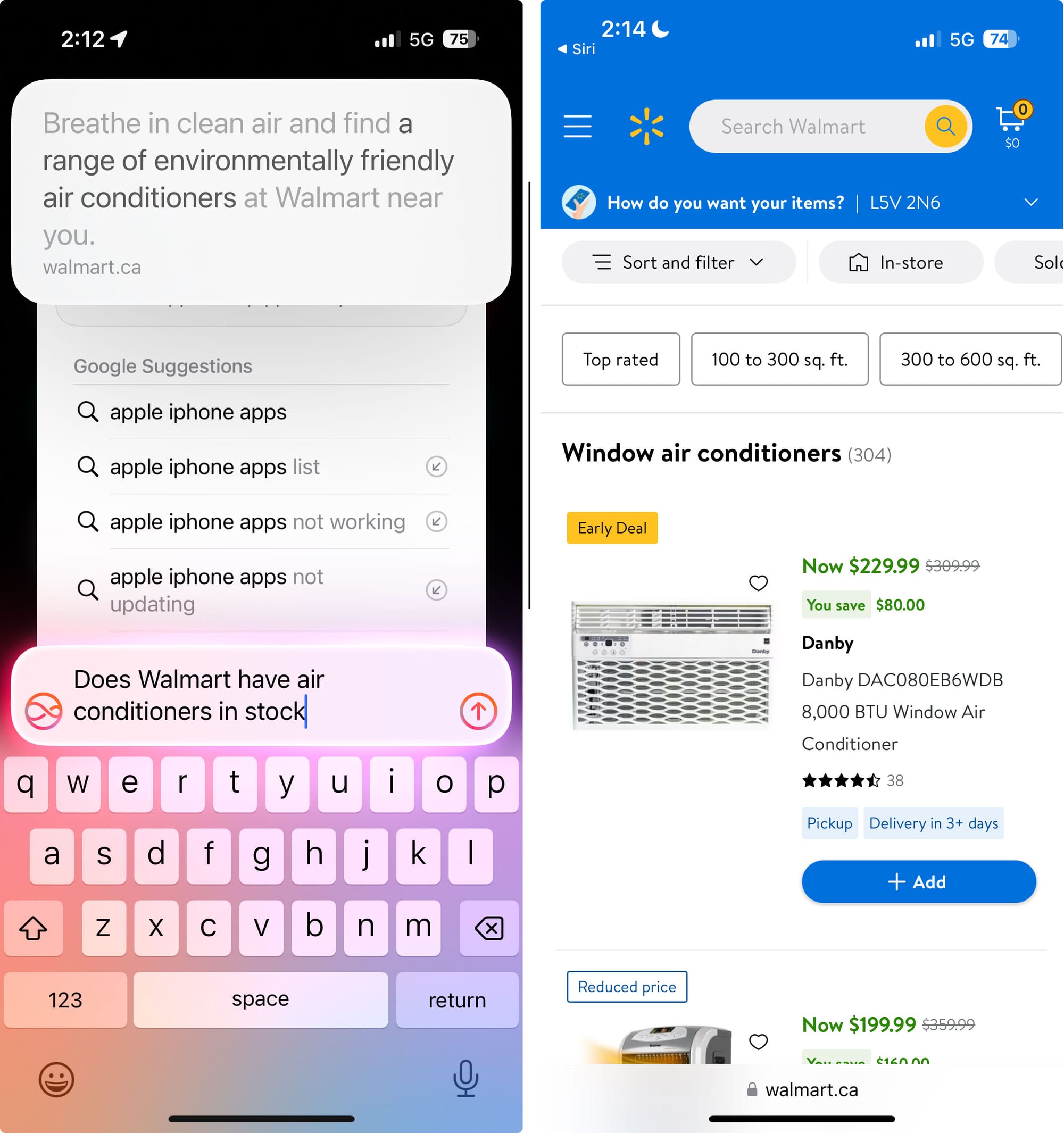 Products are obviously something that folks search frequently on Google and Amazon. I was surprised when Siri, which is supposed to deliver primarily personal and not "world knowledge," actually returned a usable result when I asked "Does Walmart have air conditioners in stock?." It gave me a brief on-screen card and then took me directly to Walmart's air conditioners page. These types of Siri product inquiries are currently quirky and unpredictable and may not be answered correctly or usefully. It is not clear if this result is just a fluke of the beta or a direction that Apple is planning on taking.