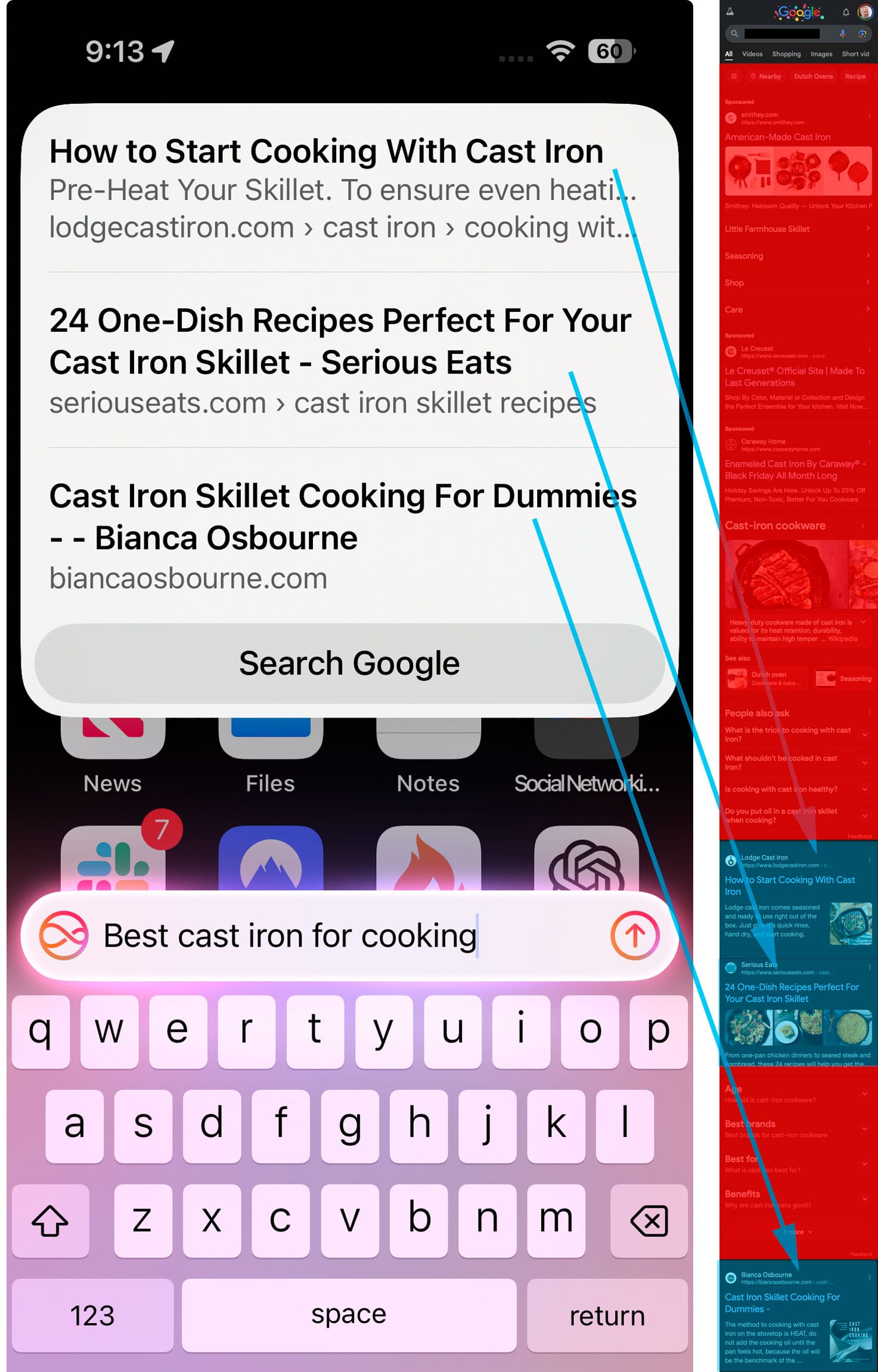 When choosing the "Search the web" option, it performs the search directly on the user’s preferred search engine —Google in my case– and opens the results directly in Safari. This approach is faster and persistent, unlike the ChatGPT responses. However, the downside is a more cluttered Google interface that you perviously could avoid.