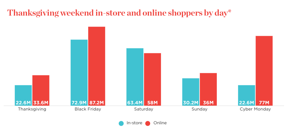 The US Thanksgiving holiday weekend was more positive for retailers than many predicted. Adobe reported Cyber Monday pulled in $11.3 billion in online sales, on top of $5.3 billion last Thursday and $9.1 billion on Friday. Salesforce reported a larger $12.2 billion number for Monday. All good news; yet many analysts still can't help framing things in zero-sum terms. For example, Numerator reported, "Cyber Weekend continues to be dominated by online shopping with more than 41% of shoppers claiming they shopped mostly/exclusively online during the weekend with over 1 in 3 saying they shopped more online and less in-store this year." The National Retail Federation reported in-store shopping was up 17% (YoY), while the number of online shoppers rose 2%. Consumers use stores and online in complex and blended ways. The online vs. offline "zero-sum narrative" obscures rather than elucidates that.