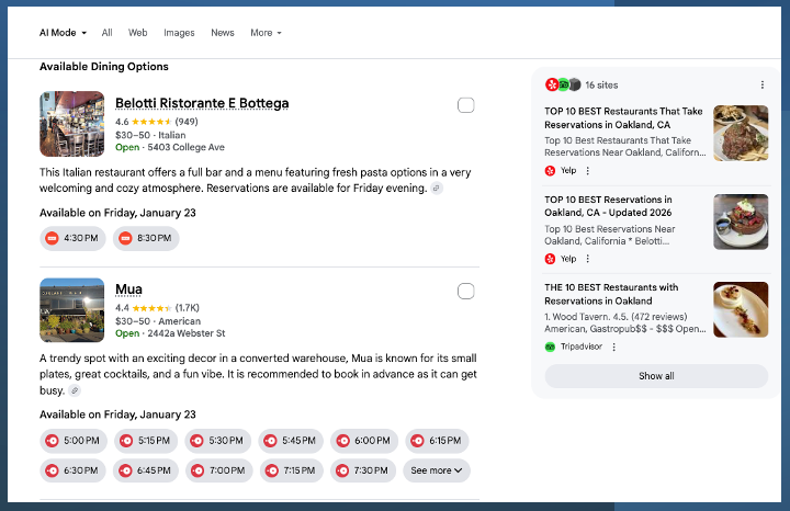 In the wake of Google's recent agentic announcements, people are spinning out grand (or dystopian) visions of an "agentic future" where human involvement in online research and transactions is substantially eliminated. And while marketers need to understand and prepare for these technologies (e.g., UCP, ACP), user behavior may take much longer to change. I'm happy to let AI do a bunch of tedious research. But when it comes to buying decisions, I'm unlikely to turn that over to a machine, however personalized. I might allow an AI agent to identify flight options to New York, or the best-rated portable iPhone chargers, or hotels in a neighborhood in a defined price range. But I'm much less inclined to let AI ultimately choose or pay for things, except in low-risk scenarios (e.g., reordering past purchases). Predictions about transactional autonomy are way premature. Local is a category, however, where agentic AI could take off relatively quickly. It will likely revolve around booking and scheduling. The AI Mode page below shows available restaurant reservations. That's the model. And it could extend to any merchant with time-based inventory, i.e., service businesses. Scheduling estimates and emergencies are well suited to agentic AI usage. Yet many variables (e.g., category, cost, complexity) will affect trust and adoption. Agents will undoubtedly compress and further disrupt the funnel, but people will still want to be involved at critical decision points. The "set it and forget it" process being described by agent-boosters is still a long way away, if it ever arrives.