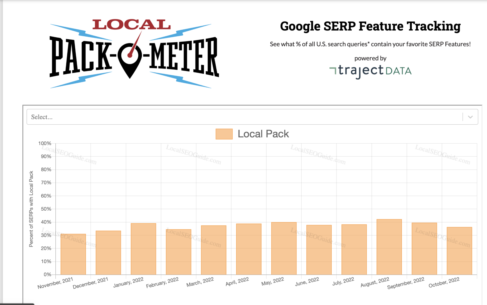 Local Packs aren't exactly disappearing but they're not showing up as often either. A week ago a number of reports from Moz, Rank Ranger and Semrush showed a decline in the appearance of Local Packs. Moz reflected the largest decline, a drop of 15 points, from 40% to 25% of search queries. The others reported less drastic drops. Now LocalSEOGuide (LSG), which also tracks Google SERP features, found that "36.2% of tracked queries contained Local Packs" in October. According to the data, that was down from a high of 42.3% in August. May was reportedly the the second highest month with 40%. LSG added that the Local Pack average over 12 months was 37.4%. LSG anticipates this will translate into fewer GBP clicks/traffic. We'll wait to hear from SEOs "on the ground" whether that's actually happening.