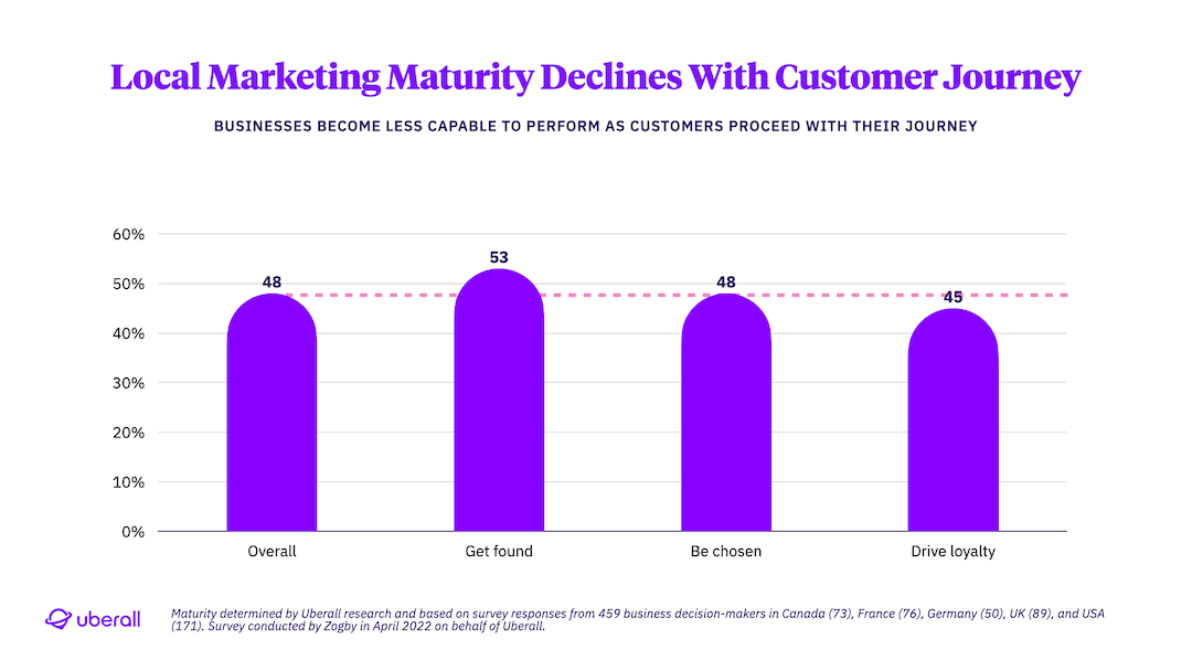 Multiple studies have shown multi-location brands (MLBs) often fail basic local marketing tests such as responding to reviews. For many MLBs, local-digital marketing remains an "untapped opportunity." A new survey from Uberall again confirms that MLBs often lag or simply fail in adopting local best practices. Uberall polled 459 multi-location marketers in North America and Europe. Multiple industries were represented: banking, insurance, service stations, convenience stores, hotels, restaurants, retail and others. Companies were scored using multiple "marketing maturity" criteria (methodology) reflecting the customer journey, from discovery to loyalty. The average score was 48%, more than 50 points short of a perfect score. Of the five countries in the sample, Canadian businesses were the most mature; Germany's were least mature. Financial services and retail were the most locally mature industries.