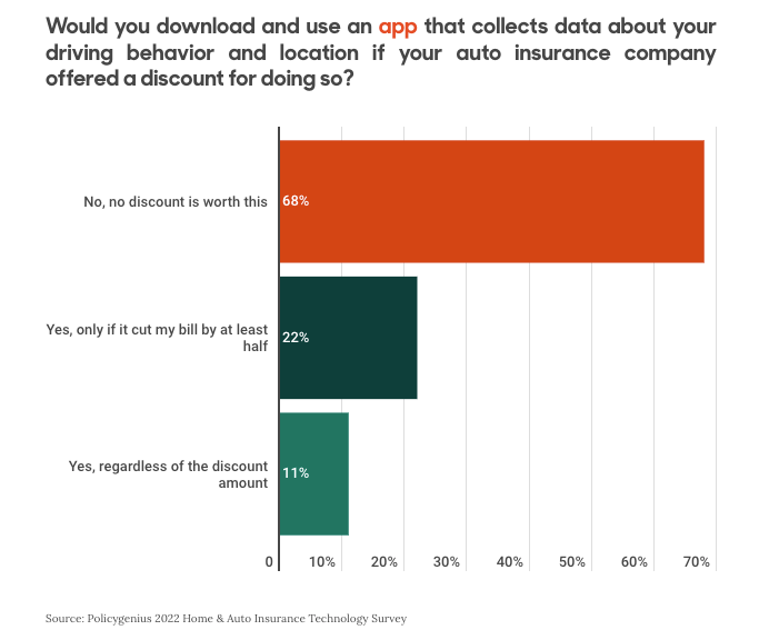 Consumers want relevant content/ads but they don't want to be monitored. They want some degree of "personalization" from brands/retailers but they value privacy even more. That's evident in a recent survey of 1,500 home, auto, or renters insurance policyholders. The survey found that a majority of Americans would not allow surveillance in exchange for discounts. The survey asked about a variety of scenarios involving home and auto insurance. Privacy won across the board. For example, 68% of respondents wouldn't install an app that tracked driving patterns or location "for any insurance discount amount." That was up 10 points vs. 2021. In addition, "77% of Americans would not install a smart doorbell camera that shares facial recognition data [ ] for any insurance discount amount." That finding also increased by 10% since last year.