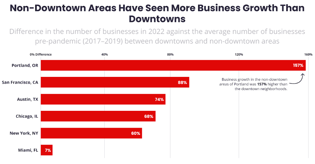 - In the chart, Portland is the city with the widest disparity between downtown and neighborhood business growth.