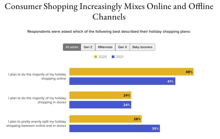Most holiday shopping surveys say a version of the same thing: consumers plan to shop online but stores remain important to their overall experience. This hybrid/both approach is emerging as dominant. According to a new Morning Consult survey, about 69% of respondents are now comfortable returning to stores. (Amazon saw flat Q3 growth partly because of a return to stores.) About 41% said they would do most of their shopping online this year, down from 48% a year ago; 35% said they would shop online and offline, up from last year. And 24% plan shop mostly in stores, identical to last year. Among age groups, Gen Z is the most omnichannel oriented, Millennials are the most online-centric and Boomers are mostly likely to shop only in stores. Among Millennials, 31% said they would shop both online and offline, while 42% of Gen Z chose that option.