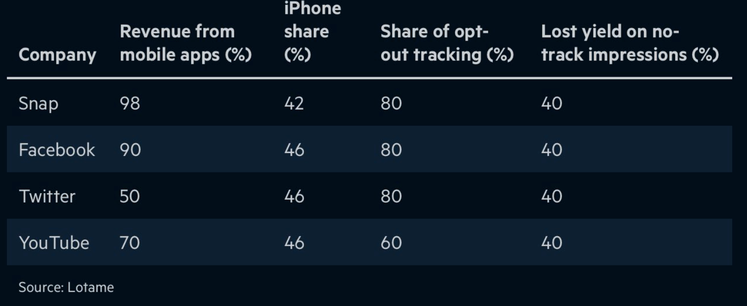 The recent Q3 earnings reports from Google/YouTube, Facebook, Snap and Twitter suggested that Apple's privacy rules had an uneven impact but, generally speaking, not a dire one. By its own reporting, Snap was the most impacted. Facebook complained but still beat earnings (though not revenue) estimates. Now, a Financial Times report argues the Apple factor was larger than it appeared – to the tune of almost $10 billion across social sites. Facebook reportedly saw the largest loss in absolute terms, while Snap had the largest percentage decline. Lotame (the source of the underlying analysis) found that the iPhone represented just under half of the mobile audiences for these sites with a mostly 80% no opt-in rate, resulting in a "lost yield" on 40% of the platforms' Q3 impressions.