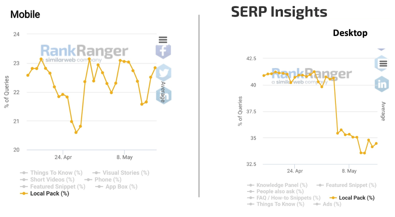 Appearances of the Local Pack again seem to be in decline. We've written about this in the past but local SEOs continue to raise the issue. Joy Hawkins did so this week. And RankRanger's Tzvi Barish shows a big decline in the frequency of Local Packs on the desktop – but no similar drop for mobile. Interestingly, the RankRanger data reflects desktop Local Pack declines from just over 40% in early May to about 34% a week ago. In mobile results, the Pack appears for about 23% of queries, without much change. This is somewhat counterintuitive. Why is Google showing the Local Pack more often in desktop SERPs when the operating assumption (based on Google's own statements) is that mobile search more often carries a local intent? By comparison, LocalSEOGuide shows Pack appearances in April (most recent data) at just under 43%. It's not clear what's going on; we'll have to keep watching this space.