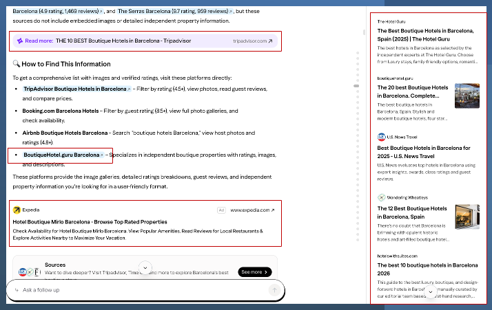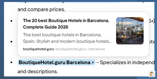 A search I did for independent hotels in Barcelona Spain (above) yielded multiple links and branded site references. It's not clear why all the site mentions aren't links. But the Yahoo approach (blue highlighting) is superior to the tiny source "buttons" on, for example, ChatGPT – or the customary source box in the right panel, which this also has.