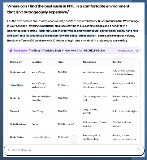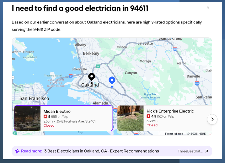 Without trying to verify the accuracy of any of the business listings or reviews data, I thought Scout did a decent job with Local results. It appears to be drawing upon many of the same directories and editorial sources used by Gemini and ChatGPT, which vary widely by category. There's also a relationship with Yelp, though Yelp's presence was inconsistent.