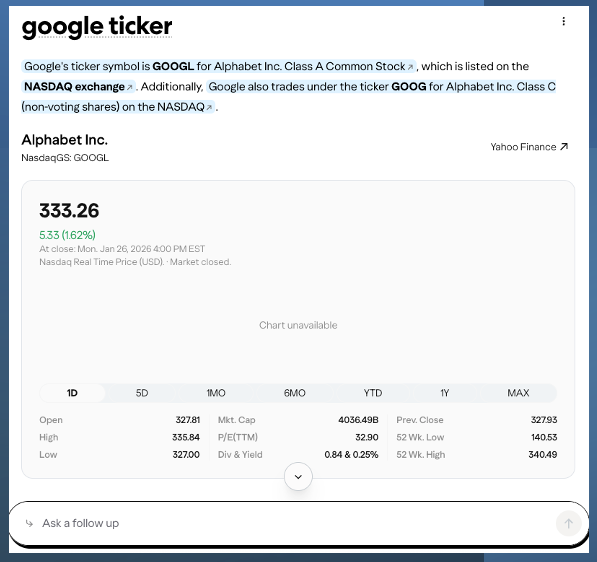 Many of the Scout results have a consistent format, and Local seems to follow that pattern. There's usually a short narrative at the top, often with multiple links, some sort of table or comparison grid and then bulleted lists discussing features or individual listings/products. Often there are vertically or context-specific elements in the SERP, such as a map for Local or a ticker graphic for a stock lookup (below).