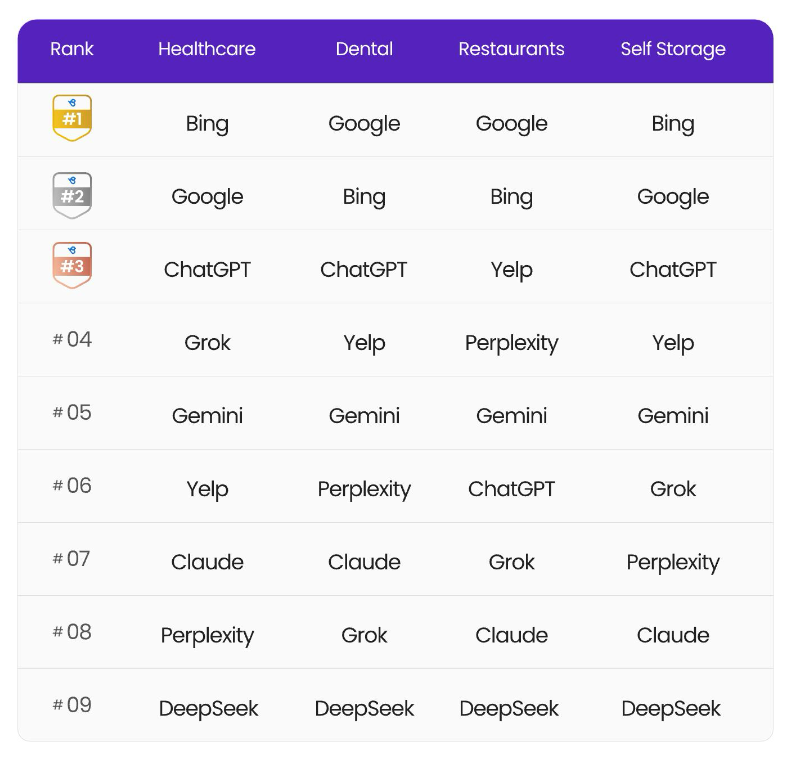 More than two-thirds of consumers have used ChatGPT for local business discovery. Yet local search is not a common use case for AI. That's because most consumers see Google as a more accurate source of local data and information. That perception is confirmed in a new local accuracy benchmarking study from Birdeye. The company ran 2,400 "near me" prompts in urban, suburban and rural areas of Illinois across four verticals (Dental, Healthcare, Restaurants, and Self-Storage). The contestants were Google, Bing, Yelp, ChatGPT, Gemini, Perplexity, Claude, Grok and DeepSeek. Birdeye used multiple criteria to evaluate the accuracy and relevance of the results for each platform, including whether listings returned were current, correct and proximate to the searcher. Google and Bing performed the best in the study and essentially tied. After that, Yelp and ChatGPT were pretty neck-and-neck. Then came Gemini and the other AIs. DeepSeek was the worst performer of the group. AI platforms committed multiple errors not seen in the search engines: made-up listings, too-remote businesses, stale listings (closed) and bad categorization (not relevant). ChatGPT, the best AI performer, delivered location-accurate results in urban areas but struggled in more remote locations. It also returned 40% fewer listings than Google and Bing.