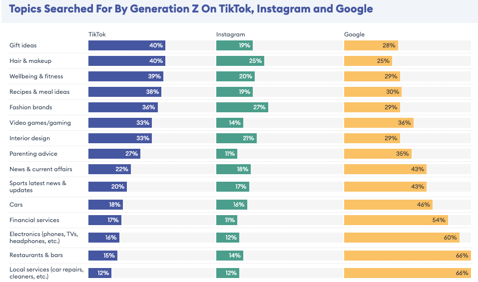 A recent SOCi survey found that Google was the #3 choice among 18 - 24 year olds for local business discovery. Instagram and TikTok, in that order, bested Google. This is consistent with Google's internal research, other surveys and anecdotal reports. Now a new study (n=2,000) from Forbes Advisor and Talker Research affirms the SOCi findings, pointing to increasing use of social media as a Google alternative for GenZ. Google remains dominant across the general population, but usage is ebbing for younger users. Among the Forbes findings, GenZ uses Google 25% less than GenX. There was also a 30% gap in Google use for brand lookups by GenZ vs. Baby Boomers. Here, TikTok was preferred to Instagram for certain categories of business search. Google remains dominant for service business queries and restaurant searches. In terms of the "why," 29% of respondents said they "opt to search on social media primarily for convenience" because they're already the platform in question. In addition, "22% of respondents favor social media for its quick results and the engaging nature of its content, particularly videos, over text-based articles."