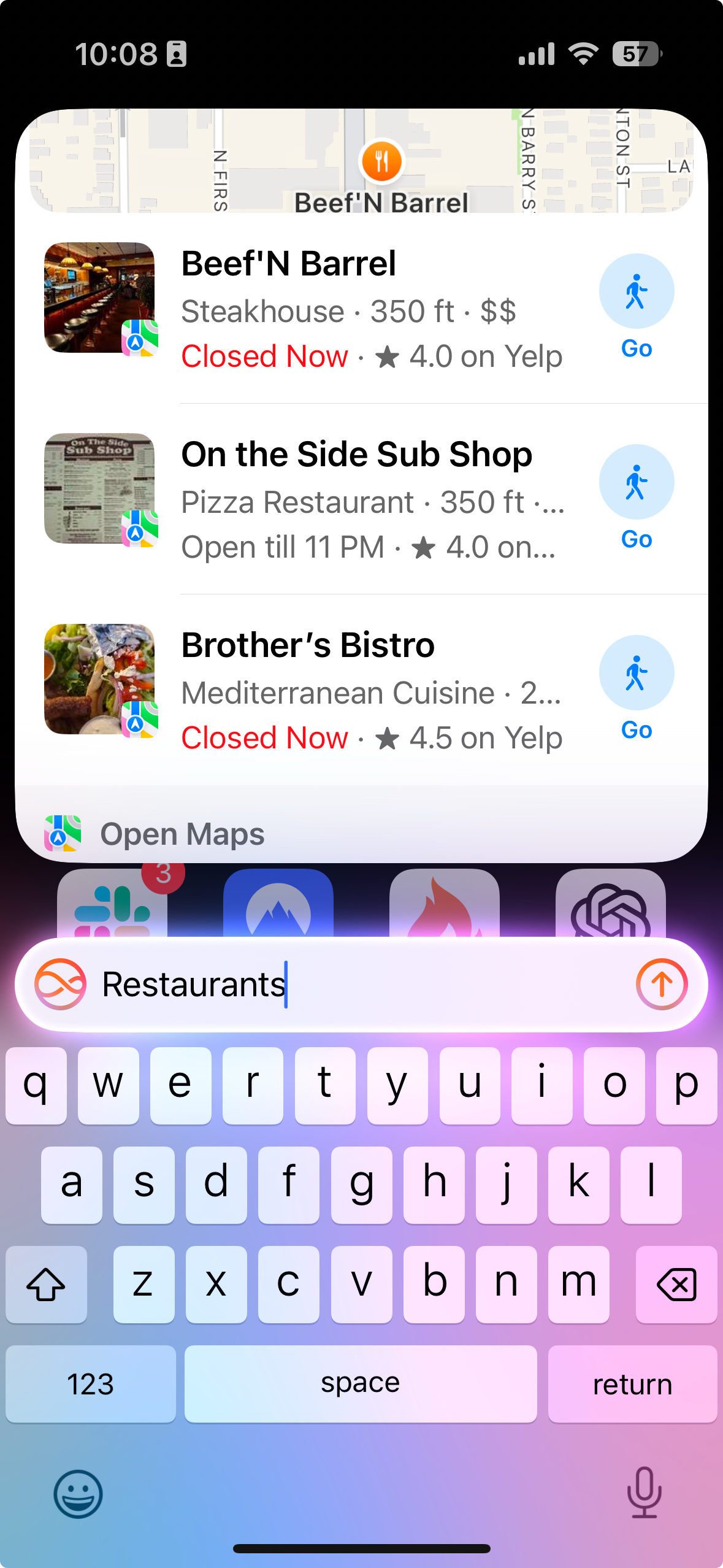 The best way to test out Siri's new local search functionality, is to use the new Type- to-Siri feature that enables Siri to accept text input. This is available from any compatible iPhone with a double-tap of the bar at the bottom of any screen. By making local search available on every screen, Apple is greatly reducing the need for conventional internet search. The Type-to-Siri feature not only eliminates the awkwardness of talking to your phone, it dramatically increases accuracy and eliminates any potential Siri misunderstanding.