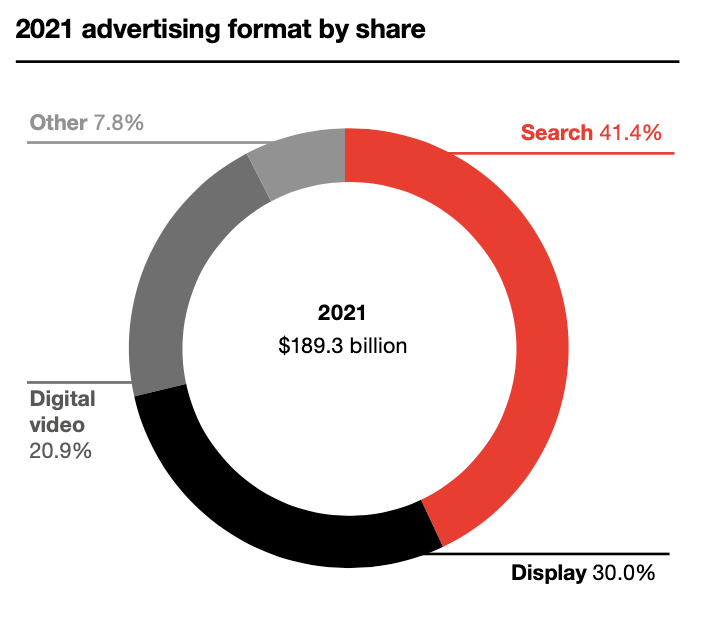Most of the major tech companies, except Amazon, this week reported good-to-strong Q1 revenues -- though some have warned on the outlook for Q2. Apple in particular had a massive quarter and beat revenue expectations by about $4 billion. But Google and Microsoft both reported strong search revenue growth. Google had total ad revenue of $54.7 billion (vs. $44.7 last year). That 22% growth was exceeded by 24% paid-search revenue growth ($39.6 billion vs. $31.9 billion). Microsoft reported nearly identical search revenue growth of 23%, though much smaller real dollars: ~$3 billion. Despite years of predictions about the decline of paid search, it remains the dominant online ad revenue category. Accordingly, it captured 41% of all digital spending or $78.3 billion in 2021. Nearly all of that money is Google's.