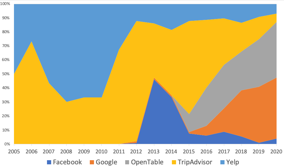 While Google has shown significant growth since 2014, it is really OpenTable's breakout that defines the story. They have continued to capture a greater percentage of reviews against Yelp, TripAdvisor and particularly Google. Even through the slowdown of 2019 and the shitshow of 2020, OpenTable continued growing their share of the corpus at a higher rate than any of the other sites.
