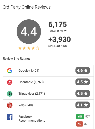 Ten Thousand Waves has a singular focus on the experience of their visitors. While they never asked for a single review, they operate in industries where organic, non-solicited reviews are common – and they have a lot of them. Even as Ten Thousand Waves expanded and added services, they mostly maintained their well-loved status, with 4.5 and higher ratings across review sites and categories. The lone exception is their restaurant listing on Yelp, which has a 3.5 star rating. (The graphic below consolidates the spa and restaurant scores.)