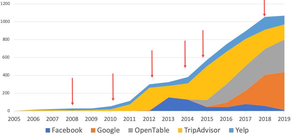 - 2015 - Google enters the scene and starts to see high growth.(2) Both Google and Open Table start to take off, largely impacting TripAdvisor, which had somewhat rebounded from the Facebook effect.